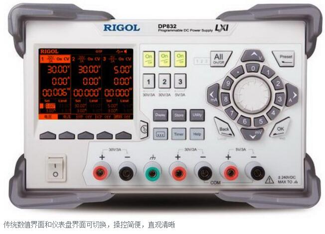 DP832是一款高性能的具有三路输出的可编程线性直流电源。它拥有纯净输出,优异的性能指标,多种分析功能,丰富的接口,可满足多样化的测试需求。