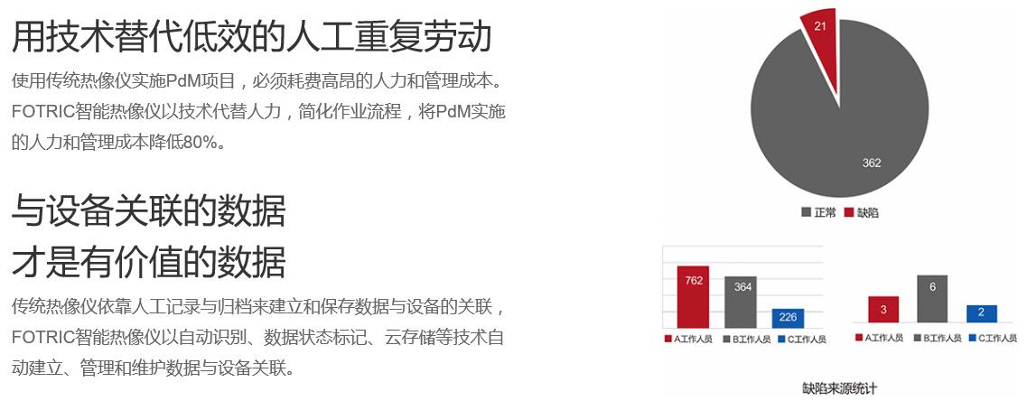实施成本主要包括人力和管理成本,可控的实施成本是项目成功的前提。FOTRIC 230系列智能热像仪在数据采集、归类、存储、挖掘、查询等全流程实现自动化,显著降低PdM项目实施成本。