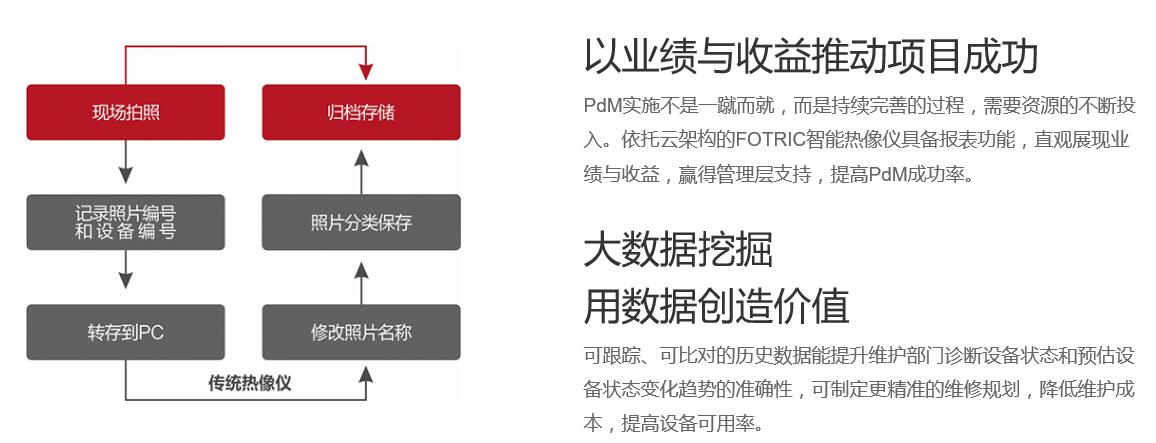 立足PdM思维,FOTRIC 230系列智能热像仪整合移动互联和云存储,进化为设备状态数据采集与管理终端,让流程低成本落地;通过云计算挖掘热像数据价值,提升设备维护效率。