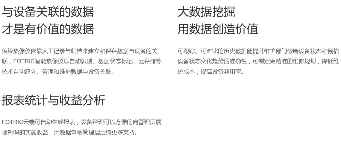 CM时代的传统热像仪,无法满足PdM项目对数据积累、管理和挖掘的严苛要求。FOTRIC 320系列热像仪融合移动互联、云存储、云计算等前沿技术,平滑升级到PdM模式,帮助设备经理实施数据挖掘和收益分析,推动PdM项目顺利落地。